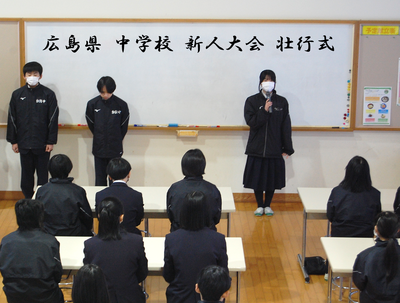 広島県 中学校 新人大会に出場します! 投稿: 編集者1 (01/23) 1月24日の広島県中学校新人大会バレーボールの部と、31日の卓球の部に出場します! その壮行式を23日(金)に行いました。出場選手は、加計中学校の代表として、また、芸北地区の代表として、大会に出場できることへの感謝の気持ちと、これまでの練習の成果を発揮することを誓いました。 Tweet -